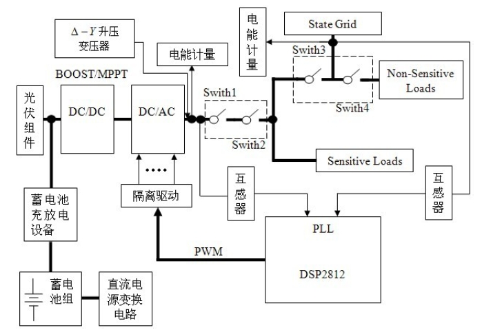 微網(wǎng)逆變器系統(tǒng)將可再生能源(如太陽(yáng)能,風(fēng)能,水能,地?zé)崮埽镔|(zhì)能等)轉(zhuǎn)變?yōu)榕c電網(wǎng)同頻、同相的交流電,優(yōu)先輸送給當(dāng)?shù)刎?fù)荷供電,剩余的電能饋入電網(wǎng)。微網(wǎng)逆變器系統(tǒng)主要包括:光伏組件,蓄電池組,蓄電池充放電設(shè)備,DC/DC 變換器,微網(wǎng)逆變器,靜態(tài)開關(guān)等。