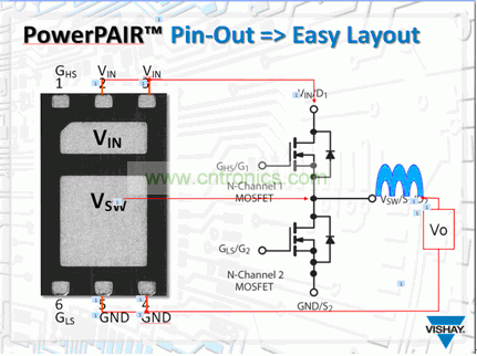 PowerPAIR就是這樣的一種封裝類型,這種封裝的外形尺寸比單片功率6 x 5封裝 (PowerPAK SO-8)小,最大電流可以達到15A。在筆記本電腦中,一般象這么大的負載電流都會采用兩個功率6 x 5封裝,算上導線和打標簽的面積,以及兩個器件的位置擺放,占用的面積超過60mm2。這種雙芯片功率封裝的尺寸是6.0mm x 3.7mm ,在電路板上占用的面積為22mm2。能把電路板空間減少63%對電源工程師是很有幫助的,因為他們給電源電路設計的空間是越來越少了。用傳統的SO-8雙芯片功率型封裝,是沒法取得這么大的好處的。