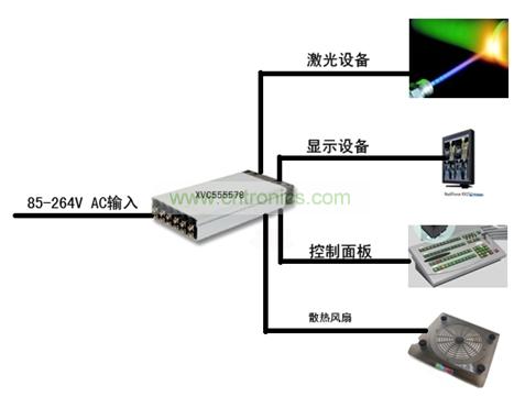 設(shè)備總功率約為1,100W,滿足醫(yī)療設(shè)備認(rèn)證,需要四組不同直流輸出,首先是大電流的48V、20A用于激光設(shè)備, 其次需要一個(gè)18V用于LCD顯示器,再次需要一個(gè)5V用于控制面板,最后還需要一個(gè)12V用于系統(tǒng)散熱風(fēng)扇。這個(gè)客戶找了很多品牌的產(chǎn)品都無(wú)法定型,因?yàn)殡娫聪到y(tǒng)太復(fù)雜,價(jià)格太高,占用的空間太大,最后他選擇了Excelsys,在40.5×260×127mm(1U高)的封裝內(nèi)解決了問(wèn)題。