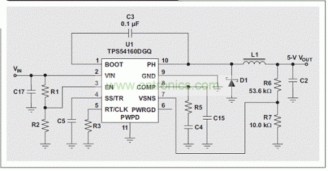 為了說明使用高開關頻率的權衡過程,我們設計了三個獨立電源,其工作頻率分別為100、300和750 kHz。所有這三種設計,輸入電壓均為48V,輸出電壓均為5V,而輸出電流均為1A。這些要求常用于為一個5-V邏輯USB,或者為其它DC/DC轉換器使用的中頻通用5-V總線供電,例如:低壓降穩壓器等。若想建立一些設計限制,所選允許紋波電壓需為50mV,其約為輸出電壓的1%;同時選擇使用0.5 A的峰至峰電感電流。德州儀器TPS54160是一種集成MOSFET的2.5-MHz、60-V、1.5-A降壓DC/DC轉換器,用作所有設計的穩壓器。TPS54160特有外部補償和快速可編程頻率,適用于一些高輸入電壓的工業應用。