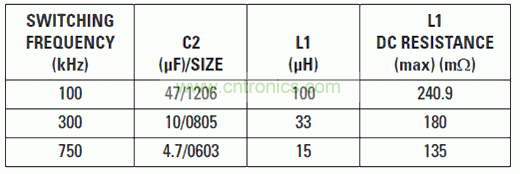 本例中,我們可以通過750-kHz開關頻率來產生一個5-V輸出電壓(參見表2)。但是,如果該頻率為1 MHz,則最低可能輸出電壓被限制為約6V;否則,DC/DC轉換器會跳過脈沖。替代方法是降低輸入電壓或者頻率。在選擇某個開關頻率以前,你最好是先查看DC/DC轉換器數據表,了解保證最小可控“導通”時間。