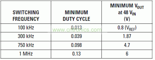最小可控“導通”時間限制是DC/DC轉換器IC的一個特點,其為脈寬調制(PWM)電路的最窄可達脈寬。在降壓轉換器中,開關周期期間功率MOSFET導通的時間百分比被稱作占空比,其等于輸出電壓與輸入電壓的比。使用TPS54160轉換器時,占空比為0.104(4 V/48 V),而數據表中列出的最小“導通”時間為130 ns。可控脈寬限制產生一個最小可達占空比,而用最小“導通”時間乘以開關頻率,我們可以輕松地計算出該占空比的大小。一旦知道了最小占空比,利用VIN乘以最小占空比,我們便可以計算出最低可達輸出電壓。最低輸出電壓同樣也受轉換器基準電壓的限制,使用TPS54160時其為0.8V。