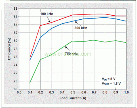 三個例子的重要損耗組成部分,來自于FET驅動損耗、FET開關損耗和電感損耗。FET電阻和IC損耗是一致的,因為所有三個設計中都使用了相同的IC。由于所有例子中都選擇了低ESR的陶瓷電容,因此電容損耗可以忽略不計。為了表明高頻開關的影響,我們對每個例子的效率都進行了測量,并將其顯示在圖2中。該圖清楚地表明,效率隨開關頻率增加而下降。若想提高所有頻率下的效率,需要尋找到一種全負載狀態下低漏到源“導通”電阻、低門電荷或者低靜態電流規范的DC/DC轉換器;或者尋找到一些具有更低等效電阻的電容和電感。