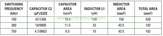 表4列出了三種設計要求的總電路板面積,以及電容和電感的焊盤面積。電容或者電感的建議焊盤面積,稍稍大于單個組件本身,且三種設計舉例均使用了該面積。每個組件占用的面積相加(其包括IC、濾波器以及所有其它小型電阻器和電容的焊盤尺寸),然后將得到的結果乘以2倍(考慮到組件的間距),便得到總面積。100-kHz和750-kHz設計之間存在近250 mm2的總面積節省,從而使濾波器體積縮小50%,而板空間占用減少55%。但是,存在收益遞減規律,因為電容和電感值無法減少至零!換句話說,不斷推高頻率并不能夠一直減小總尺寸,因為你無法總是能夠在市場上買到這些尺寸適合且批量生產的電感和電容。注意,33-µH和15-µH電感占用相同的面積。存在這種可能性,是因為33-µH電感的高度為3.5 mm,而15-µH電感僅高2.4 mm。我們想通過這兩種電感來說明的觀點是:電感與體積成正比例關系。