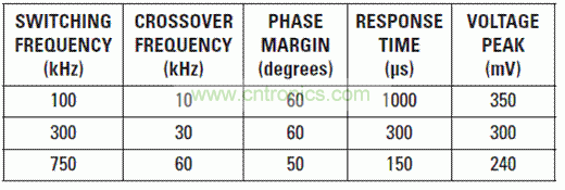 瞬態響應是電源性能級別的一個較好指標。我們利用每種電源的波特圖來表明高開關頻率的對比情況(參見圖3)。如圖所示,每個電源的相位裕度在45°和55°之間,其表明瞬態響應得到較好的抑制。交叉頻率約為開關頻率的1/8。使用快速開關DC/DC轉換器時,設計人員應確保電源IC誤差放大器具有足夠的帶寬來支持高交叉頻率。TPS54160誤差放大器的單位增益頻寬一般為2.7 MHz。表5顯示了實際瞬態響應時間以及電壓峰值過沖的相關值。開關頻率越高,過沖值便越是更低,原因是更寬的帶寬。