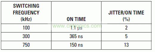 高轉換比和更高頻率時,會存在噪聲問題。當選擇某個高開關頻率時,設計人員應考慮抖動和DC/DC轉換器的最小“導通”時間。當占空比較小時,抖動噪聲便為開關脈沖的更大百分比。表6顯示了48-V到5-V轉換比時,抖動與“導通”時間之比。我們假設,在該相位節點上存在0.5-V二極管壓降和20-ns抖動。