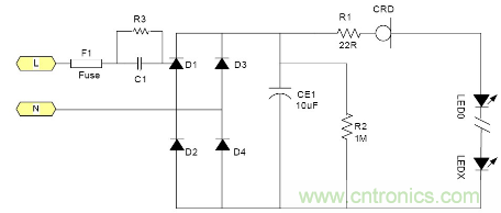 由于恒流二極管需要一定的電壓Vk才能夠進入恒流, 所以太低的電源電壓是無法工作的。通常這個Vk大約在5-10V左右 所以大多數采用電池供電的LED是無法工作的, 最大電流由于恒流二極管的功耗受到限制, 所以過大的電流也是不合適的。例如1W的LED通常需要350mA, 恒流二極管就很難提供, 目前比較合適的使用場合就是交流市電供電的LED燈具采用很多小功率LED串聯也就是高壓小電流的情況是最為合適;但是由于恒流二極管的耐壓有一定的限制 所以它所能吸收的電源電壓變化也是有限的。就拿100V耐壓的CRD來說用在220V市電電源里都還只能對付有限的電壓變化。220V經過橋式整流以后它的輸出直流電壓大約為264V.如果市電變化+10%  ~-15%就相當于整流后為290~187V, 電壓變化103V.已經超過其耐壓了。因為LED伏安特性的非線性 所以很難用公式來表示。總之當市電電壓降低時LED中的電流就會隨市電電壓的降低而降低。其亮度也會跟著變。 典型應用電路中圖3為典型的應用電路, 圖4為加了阻容降壓的應用電路為了應對低電壓的輸出場合。