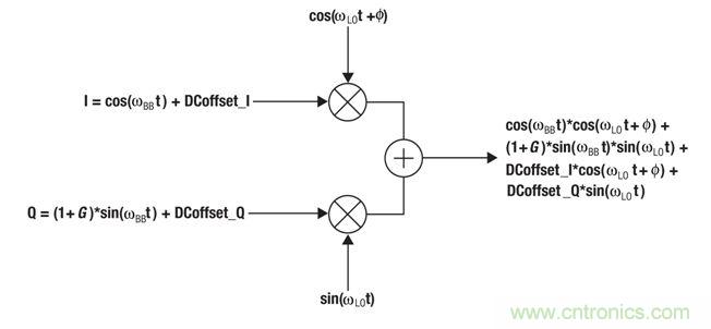 DC 偏移會與 LO 混頻,產生 LO 饋通,即?LO的頻率。I和Q分支的DC偏移加入正交,形成以下的LO饋通振幅: