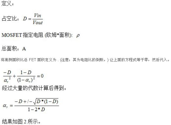 通過圖1,我們知道50%轉(zhuǎn)換比率時出現(xiàn)最佳傳導(dǎo)損耗極值。但是,在其他轉(zhuǎn)換比率條件下,可以將損耗降至這一水平以下。附錄給出了進行這種優(yōu)化的數(shù)學計算方法,而圖2顯示了其計算結(jié)果。即使在極低的轉(zhuǎn)換比率條件下,F(xiàn)ET芯片面積的很大一部分都應(yīng)該用于高側(cè)FET。高轉(zhuǎn)換比率時同樣如此;應(yīng)該有很大一部分面積用于低側(cè)。這些結(jié)果是對這一問題的初步研究,其并未包括如高側(cè)和低側(cè)FET之間的各種具體電阻值,開關(guān)速度的影響,或者對這種芯片面積進行封裝相關(guān)的成本和電阻等諸多方面。但是,它為確定FET之間的電阻比提供了一個良好的開端,并且應(yīng)會在FET選擇方面實現(xiàn)更好的整體折中。