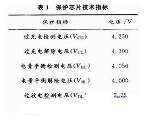 圖5摘取了保護板1中前三級(1~3級)保護電路,6~10級保護電路與此相似。所選取的芯片技術指標如表1所示,對于過充電、電平衡和過放電功能都有其檢測和解除電壓,以確保各狀態的可靠進入和退出。