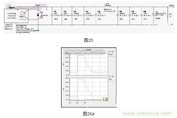 在ISO 7637-2:2004、GMW3100-08.2001:3.2.1.3等標準中規定了沿電源線的電瞬態傳導的干擾脈沖的抗擾性失效模式、嚴重程度和測量,提供了5 種典型脈沖波形,雖然沒有涵蓋所有可能出現在車輛上的各種瞬態脈沖,但適用于各種動力系統的道路車輛,例如:火花點火發動機、壓燃式發動機、電動機、混合動力驅動系統。針對這5種典型的瞬態傳導脈沖,在Saber仿真環境中進行該電源濾波器電路(圖13)的仿真如下: