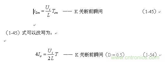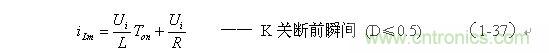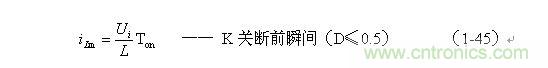 (1-44)式中iL為流過儲能電感L的電流(瞬時值),t為時間變量;i(0)為的初始電流,即:控制開關K接通前的瞬間流過儲能電感L中的電流。當開關電源工作于電流臨界連續狀態,或不連續電流狀態時(即D≤0.5),i(0) = 0 ,由此可以求得流過儲能電感L的最大電流為: