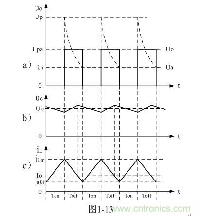 在圖1-12-a中,當控制開關K接通時,輸入電源Ui開始對儲能電感L加電,流過儲能電感L的電流iL開始增加,同時電流在儲能電感L中也要產生反電動勢eL;當控制開關K由接通轉為關斷的時候,在儲能電感L兩端就會產生反電動勢eL。eL反電動勢的方向與開關K關斷前的方向相反,但與電流的方向相同,因此,在控制開關K兩端的輸出電壓uo等于輸入電壓Ui與反電動勢eL之和。