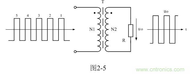 為了簡單起見,我們把雙激式變壓器開關電源等效成如圖2-5所示電路。圖2-5與圖2-1所示電路的不同之處在于,圖2-1輸入電壓是直流脈沖方波,而圖2-5輸入電壓是交流脈沖電壓方波。因此,圖2-5所示電路與一般的變壓器電路在工作原理上沒有根本的區別。