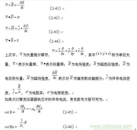為鐵芯的電阻率,負號表示渦流產生的磁場方向與勵磁電流產生的磁場方向相反。rot E和rot Hx分別表示電場和磁場的旋度,即渦旋電場和渦旋磁場的強度。Hx、Hy、Hz分別磁場強度H的三個分量;Bx、By、Bz分別磁感應強度B的三個分量;Ex、Ey、Ez分別電場強度H的三個分量。