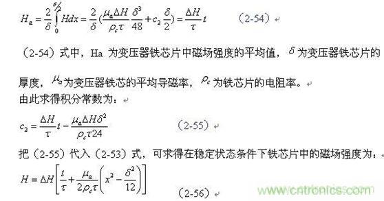由于在變壓器鐵芯片內,截面磁場強度的平均值Ha,在任一時間內都必須等于電磁感應所要求的值,即滿足(2-40)式的要求,因此對應圖2-19對(2-53)式求平均值得: