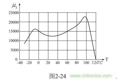 順便說明,圖2-24中的初始導磁率 一般是用磁環作為樣品測試得到的,測試信號的頻率一般比較低,僅為10kHz,并且測試時一般都選用最大導磁率作為結果;因此,實際應用中的開關變壓器鐵芯的導磁率并沒有這么高。