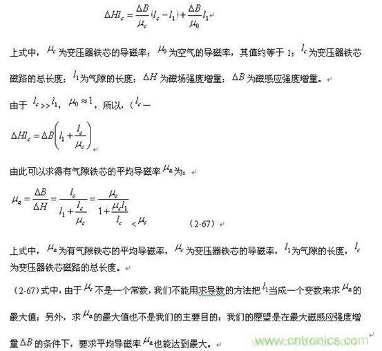 最大值的條件;當然是氣隙長度越小,平均導磁率 就越大。但在實際工作中, 的值要小于此值,因為,對氣隙長度要預留一定的余量,變壓器鐵芯的工作點不可能讓永遠工作在最佳值的邊沿;因此,實際工作中的變壓器鐵芯,其最大磁感應強度增量和最大磁場強度增量都會超出(2-68)式給出條件的范圍;所以,由(2-68)式求出的氣隙長度 也是最低極限值。