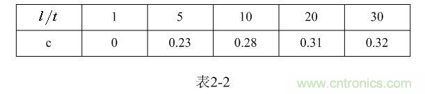 【說明】上式是用來計算多層線圈繞組、截面為圓形的空心線圈的電感計算公式。長岡系數k可查閱表2-1,系數c可查閱表2-2。當線圈內部有鐵芯時,有鐵芯線圈的電感是空心線圈電感的