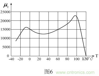 圖6是日本TDK公司高導磁率材料H5C4系列磁芯初始導磁率 隨溫度變化的曲線圖,其居里溫度大約為105℃。