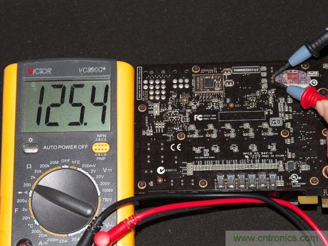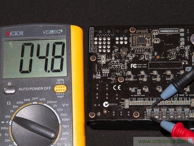 焊接完成后一是要用放大鏡配合電路圖仔細的測量各個元器件之間的連接關系,確定有無短路和虛焊。另外一個簡單的辦法就是通過直接測量供電回路的電阻值(關機狀態下)來確定是否有明顯的焊接失誤。通常來說GPU核心供電回路的電阻值在1歐姆到10幾歐姆之間,而顯存供電回路則是100-140歐姆左右。至于測量點,選擇核心和顯存供電模塊輸出電容的兩個引腳就可以了。可以看到改造前后核心、顯存供電回路的電阻值都在4.8歐/125歐左右,因此焊接是沒有問題的。
