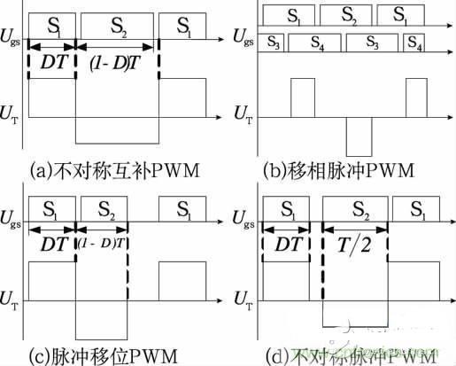 控制型軟開關半橋DC/DC變換器不增加主電路元器件(可增加電感電容元件以實現軟開關條件),通過合理設計控制電路來實現軟開關。圖1給出4種控制型軟開關半橋DC/DC變換器的PWM控制策略。