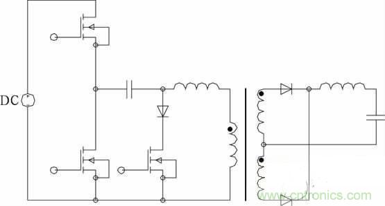 不對稱脈沖PWM 控制,其下管下降沿與上管的前沿互補,上管可實現ZVS。只要設計的占空比較小,無需其它措施即使工作在較高頻率下開關損耗也很小。變壓器直流偏磁,除占空比端點外,偏磁電流小于不對稱半橋。寬范圍適用性優于傳統的不對稱半橋。低壓大電流的應用場合有一定的優勢。