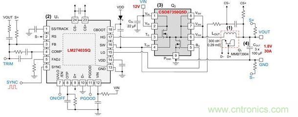 (2) PWM 控制器 — 現在,如果設計特別需要鐵氧體芯電感器的硬飽和特性,那么一定不能超過電感器的飽和電流。這就需要一款可充分利用寄生電路電阻實現精確無損電流傳感的 PWM 控制器(閱讀我之前的博客《在大電流轉換器中實現精確而無損的電流傳感》,了解有關該主題的更多詳情)。其它主要特性包括高效率柵極驅動器、遠程 BJT 溫度傳感以及快速誤差放大器等。