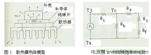 散熱器是開關(guān)電源的重要部件,它的散熱效率高與低關(guān)系到開關(guān)電源的工作性能,散熱器通常采用銅或鋁,雖然銅的熱導率比鋁高2倍但其價格比鋁高得多,故目前采用鋁材料的情況較為普遍,通常來講散熱器的表面積越大散熱效果越好,散熱器的熱阻模型及等效電路如圖1所示。