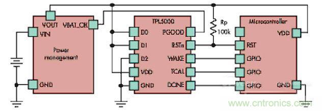 新式解決方案采用針對(duì)長休眠期特制的定時(shí)裝置,德州儀器TPL5000具備可編程分配器,提供最高間隔64秒的蘇醒脈沖,運(yùn)作時(shí)用電量僅30nA,在極長休眠周期下,最多能為電池供電的無線傳感器延長兩年使用年限。(請見下圖)