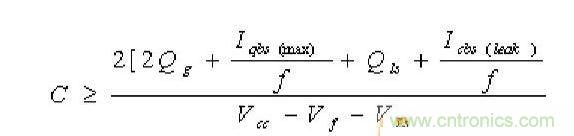 自舉電容必須能夠提供這些電荷,并且保持其電壓。否則Vbs將會(huì)有很大的電壓紋波,并且可能會(huì)低于欠壓值Vbsuv,使高端無(wú)輸出并停止工作。因此Cbs電容的電荷應(yīng)是最小值的二倍,最小電容值可以由下式計(jì)算: