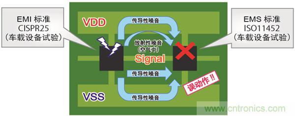 因此,對車載用產品來說,不妨礙其他設備(發射干擾)、以及受到其他設備妨礙時能保持本來的性能(抗干擾)是非常重要的。