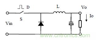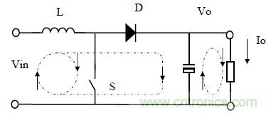 當(dāng)開(kāi)關(guān)斷開(kāi)時(shí),由于電感上的電流不能突變,電感電流就通過(guò)二極管D續(xù)流,該二極管稱為續(xù)流二極管,這樣就實(shí)現(xiàn)了對(duì)原先流過(guò)開(kāi)關(guān)管電流的續(xù)流,同時(shí)電感中存儲(chǔ)的一部份能量向負(fù)載釋放。續(xù)流電流環(huán)包括:二極管,電感,負(fù)載。在這階段流過(guò)電感上的電流用下式描述: