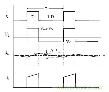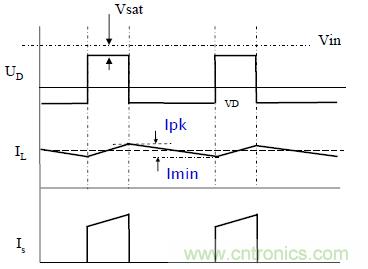在這階段,電流波形是一條斜率為負(fù)的斜線,斜率為-Vout/Lo。當(dāng)開(kāi)關(guān)再次導(dǎo)通時(shí),二極管迅速關(guān)斷,電流從輸入電源和開(kāi)關(guān)管流過(guò)。在開(kāi)關(guān)導(dǎo)通前瞬間,電感上的電流Imin就是開(kāi)關(guān)管通過(guò)的初始電流。