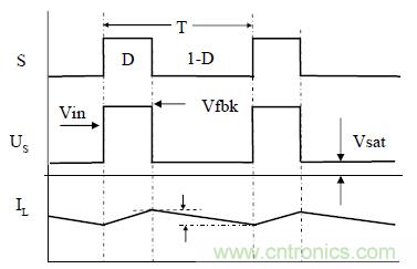 升壓變換器與BUCK變換器有著相同的組成部份,只是它們的位置被重新布置了一下。新的布局使變換器與正激式變換器的工作過(guò)程完全不同。在這種情況下,開(kāi)關(guān)管導(dǎo)通時(shí),電流環(huán)路僅在包括電感,開(kāi)關(guān)管和輸入電壓源。在這段時(shí)間中,二極管是反向阻斷的。電感電流波形也是以固定斜率上升,可用下式描述:
