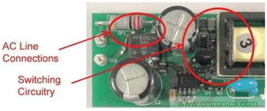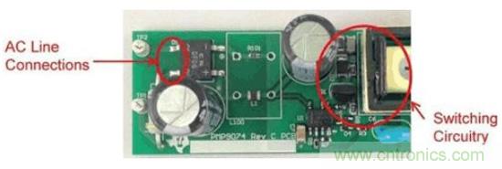 圖1是這些非計劃中電容的一個實例。圖中的右側是一個垂直安裝的FET,所帶的開關節點與鉗位電路延伸至了圖片的頂部。輸入連接從左側進入,到達距漏極連接1cm以內的位置。這就是故障點,在這里FET的開關電壓波形可以繞過EMI濾波器耦合至輸入。