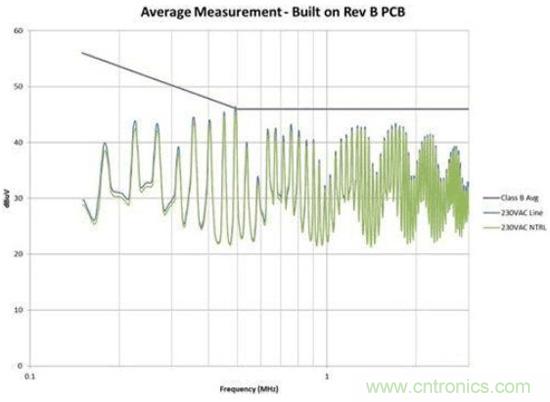 圖4是修改后的效果圖。我們在故障點位置為EMI規范獲得了大約6dB的裕量。此外,我們還顯著減少了總體EMI簽名。所有這些改善都僅僅是因為布局的調整,并未改變電路。如果您的電路具有高電壓開關并使用了屏蔽距離,您需要非常小心地對其進行控制。