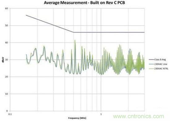 注意,漏極連接與輸入引線之間有一些由輸入電容器提供的屏蔽。該電容器的外殼連接至主接地,可為共模電流提供返回主接地的路徑。如圖2所示,這個微小的電容會導致電源EMI簽名超出規范要求。
