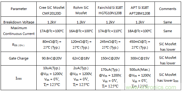 目前市面上常見的SiC Mosfet電流均不大于50A,以常見的1200V/20A為例,列舉了Cree公司與Rohm公司的SiC Mosfet管的部分電氣參數;同樣例舉了Fairchild 與APT公司的1200V/20A Si IGBT系列的電氣參數進行比較;