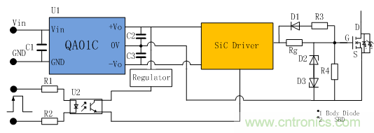 QA01C具有完整的驅動電路推薦,通過SiC驅動專用電源得到不對稱的正向驅動電壓20V,負向偏置關斷電壓-4V;為了防止驅動電壓對柵極造成損壞,增加D2和D3來吸收尖峰電壓是很有必要的。SiC驅動器采用一般驅動芯片即可;為了實現控制信號與主功率回路的隔離,需要采取隔離措施,推薦采用常見的光耦隔離方案。采用的光耦必須具有高共模抑制比(30KV/us)和比隔離電源大的隔離耐壓并且具有極小的延遲時間來適應SiC Mosfet管的高頻率工作特性。
