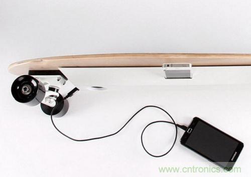 去年由荷蘭鹿特丹市的一位大學生設計的一款能對手機充電的滑板獲得了關注?;遢喿由系陌l電機旋轉運行時可產生6伏電流,電流轉換成為5伏之后進入滑板的盒子裝置中,滑板運行1個小時所產生的電能可完全對一部手機充電,并且運動得越多,充電滑板存儲的電量就越多,最多可為手機進行8次充電。