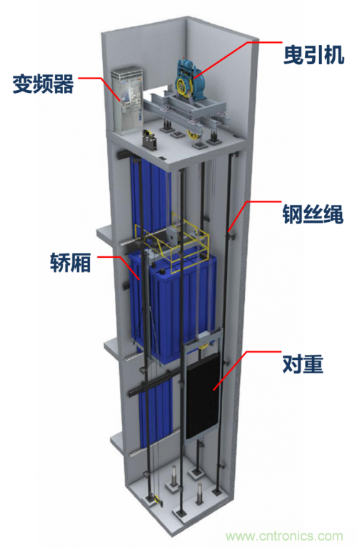 傳統電梯的動力部分主要由曳引機(卷揚機)、變頻器、轎廂、鋼絲繩、對重組成。曳引機通過卷動鋼絲繩,調節轎廂和對重的平衡,實現對轎廂高度的控制,即電梯的上下。其中曳引機本質就是一臺由變頻器驅動與控制的大功率電機,需要安置在大樓頂層——這就造成了電梯無法上頂層的問題了,因為頂層的電梯位置被曳引機和變頻器占據了。這問題一直存在了很久的時間,因為過去曳引機基本都用交流異步電機,且功率輕松上幾十KW,體積非常大,且不能露天放置,只能一直占著頂樓的房間。
