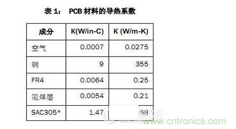 該PCB主要由FR4電路板材料和銅組成,另有少量焊料、鎳和金。表1列出了主要材料的導熱系數。