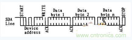 如果主設備要向EEPROM中寫數據,在地址字節中主設備向EEPROM發出一個寫請求(R/W=0),發送的地址字節之后緊跟著要發送的數據。每發送一個字節的數據后EEPROM就會產生一個應答信號,主設備也會監控應答信號,如果在發送一個字節后EEPROM沒有返回應答信號,則主設備就會停止發送,并生成一個結束信號。寫操作的時序如圖3所示。
