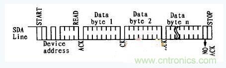要從EEPROM中讀取數據時,應設置R/W=1.在EEPROM發送完一個字節的數據后,主設備產生一個應答信號來響應,告知EEPROM主設備要求更多的數據,對應主設備產生的每個應答信號EEPROM將發送一個字節的數據。當主設備不發送應答信號并隨后發送結束信號位時結束此操作。讀操作的時序如圖4所示。