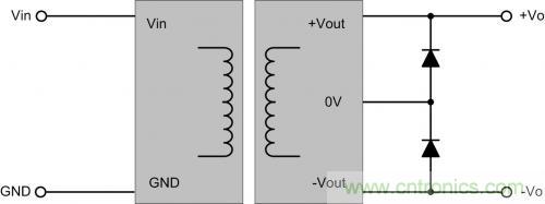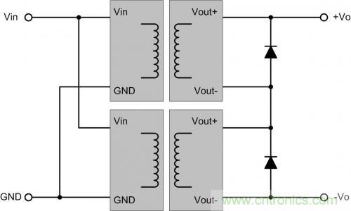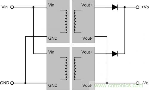 如一個5V轉±12V的電源,若臨時需要5V轉24V,可把負當地,正輸出當24V電源,輸出24VDC。應用時,在輸出各方向并聯一個二極管續流,防止兩路啟動時間不同,由一路通過負載給另一路的內部電路充電。