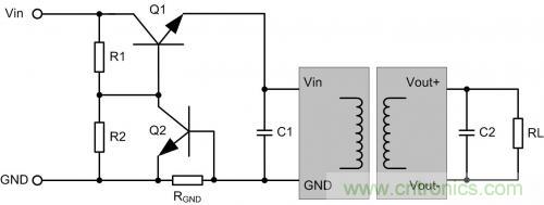 通過檢測RGND的電流,增大Q2的導通電壓后,把Q1關斷,停止供電,達到過流或短路保護的目的。
