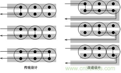 輸出濾波電容放置及走線對紋波噪聲至關重要,如圖1所示,傳統設計中由于到達每個電容的阻抗不一樣,所以高頻電流在三個電容中分配不均勻,改進設計中可以看出每個回路長度相當即高頻電流會均勻分配到每個電容中。