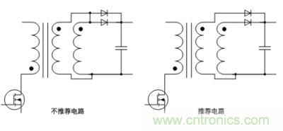 當電源輸出電流較大時,通常我們會采用兩個繞組并聯的方式進行使用,這兩個繞組通常分置于原邊繞組內外,所以直流阻抗會略有差異,從而有可能產生內部環流,電壓波形也會出現嚴重的振鈴,并且電磁干擾會變的更加嚴重,以及有可能會出現意外的大量發熱,如果輸出繞組一定需要并聯使用,最好采用如圖4的推薦電路,圖4推薦電路中二極管可以消除兩個不同繞組的不均勻導致的負面影響。