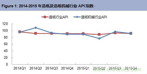 自動化產品在造紙及造紙機械行業的應用十分廣泛,主要的產品類型有傳動系統、控制系統、執行機構和過程控制儀表等。2015年四季度造紙行業自動化產品市場規模為2.32億元,同比下滑8.5%;造紙機械行業自動化產品市場規模為0.41億元,同比下滑8.4%。行業API指數均小于100。受整體經濟環境低迷、產能過剩矛盾、資源整合、行業結構調整等因素影響,且隨著“新環保法”、“水十條”等環保新政的出臺和實施,造紙行業新建和改造項目減少,從而使造紙及造紙機械行業自動化產品市場規模萎縮。